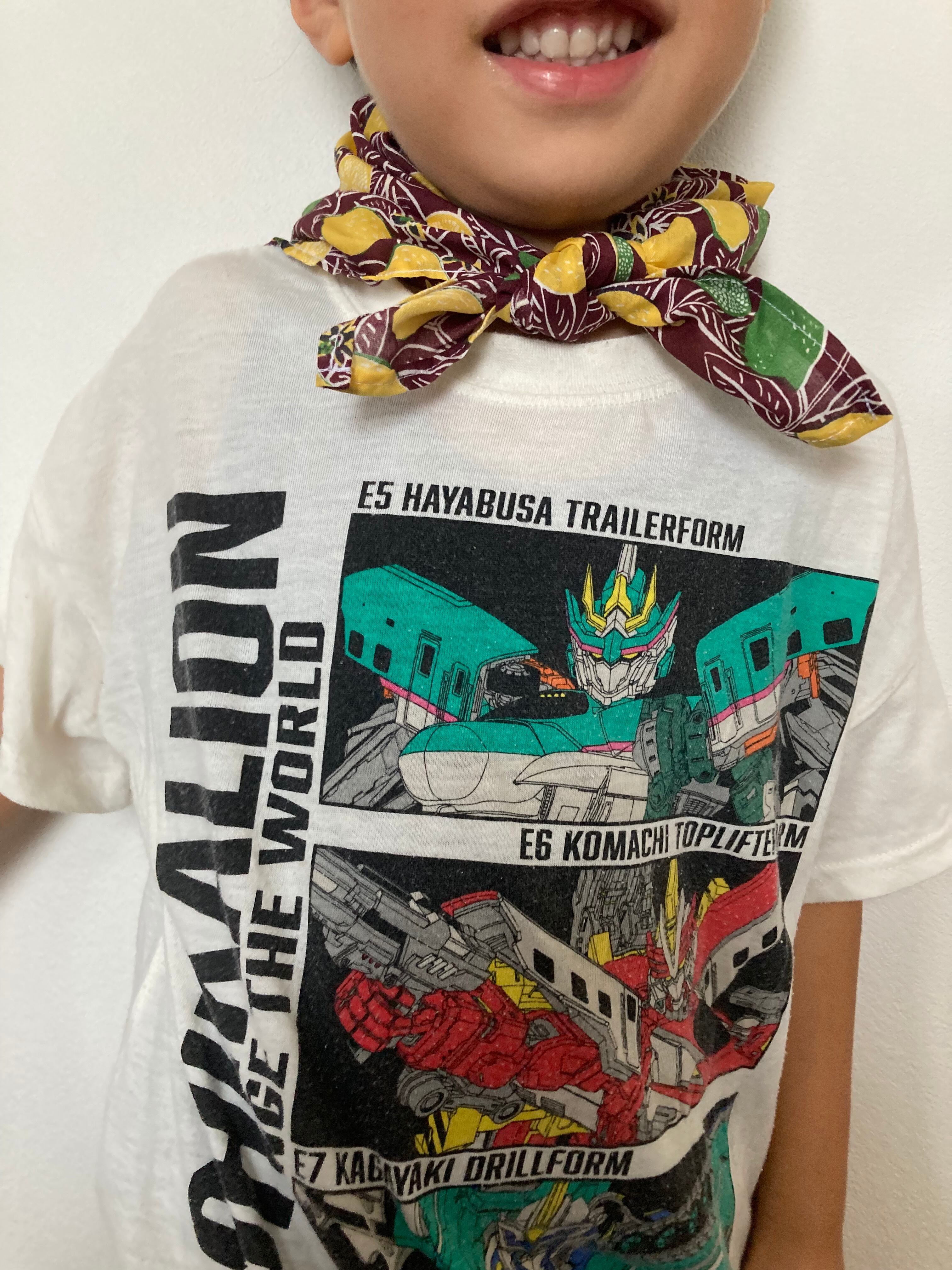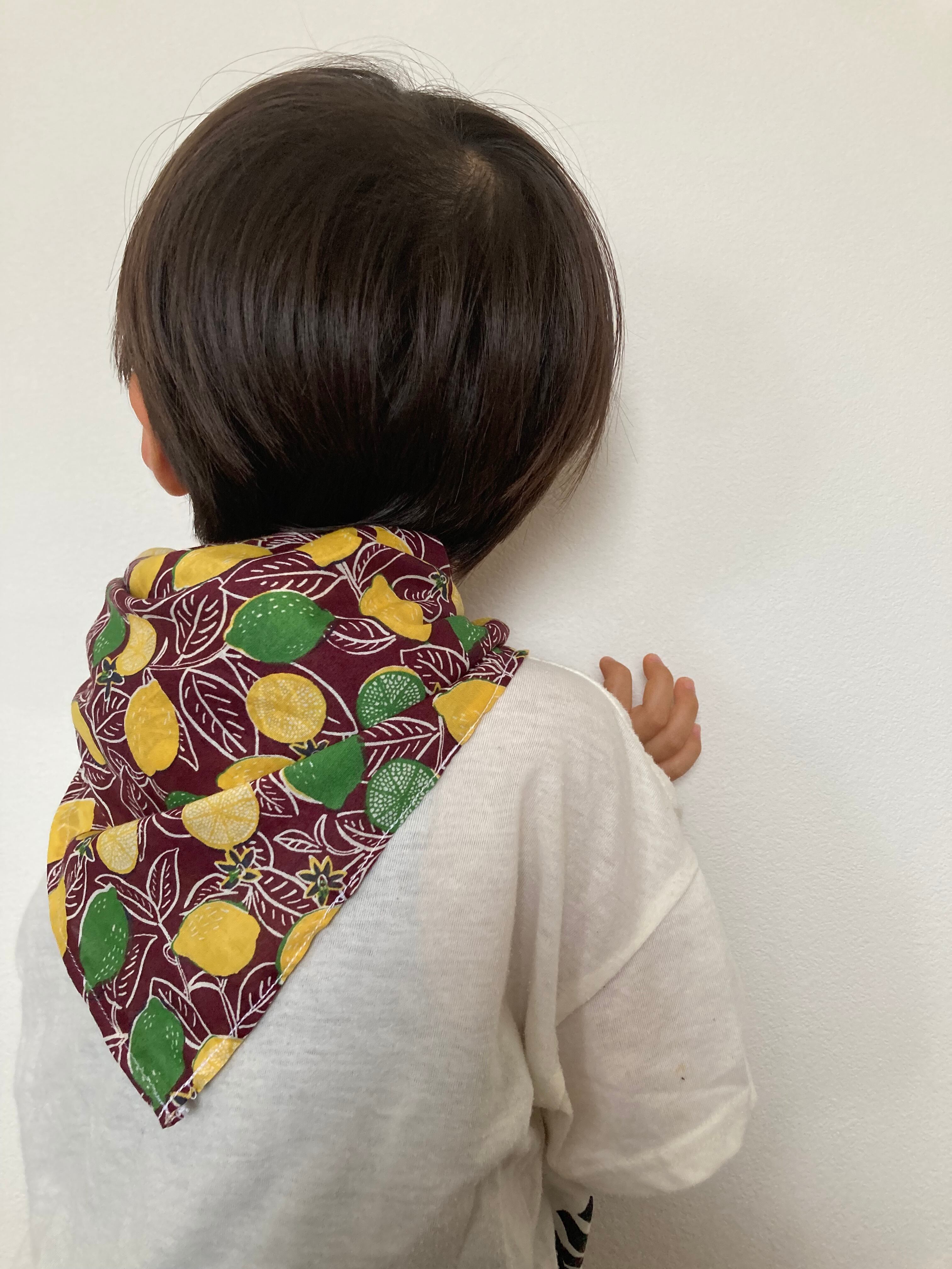 こども用にネッククール、水に濡らして振るタオルを試しましたが、結局保冷剤が一番涼しい&使いやすいという結論に至り、わが家ではこんな風に大判のハンカチを使って首元に巻くスカーフスタイルが確立されました。